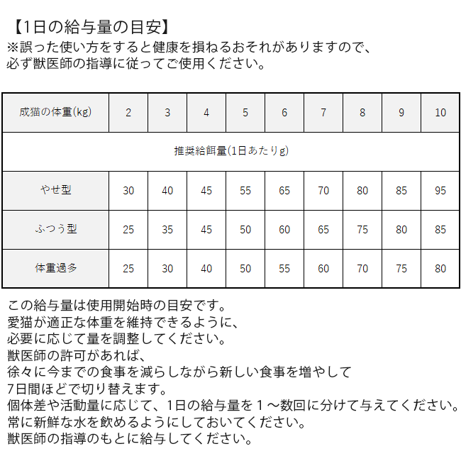 成猫の体重(kg) 推奨給餌量(1日あたりg) やせ型 ふつう型 体重過多 2 30 25 25 3 40 35 30 4 45 45 40 5 55 50 50 6 65 60 55 7 70 65 60 8 80 75 70 9 85 80 75 10 95 85 80 【原産国】イタリア 【メーカー】Monge Mongeは1963年創業のイタリア最大のペットフードメーカー 「MONGE(モンジ)」は、療法食を必要とする犬・猫や家族のために、1963年にスタートしたイタリアのプレミアムフードのメーカーです。