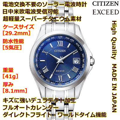 ◆ギフト対応アイコン詳細                     ■主な特徴CITIZEN EXCEED/エクシード エコ・ドライブ電波時計 商品詳細  ※ [ ]は女性用情報ムーブメントエコ・ドライブ電波時計(男性用:光発電2年 女性用:光発電3年) 精度:±15秒/月(非受信時)サイズ重量:70[40]g 厚み:10,0[8,1]mmケースケースサイズ【⇔】:39,0[30,0]mm スーパーチタニウム/デュラテクト加工 表面処理:白色めっき 5気圧防水ガラス球面サファイアガラス/99%クラリティ・コーティングバンド三ツ折れプッシュタイプ中留特徴パーフェックス搭載 日中米欧電波受信機能受信局自動選択機能 定時受信機能 強制受信機能 衝撃検知機能 針自動補正機能 充電残量表示機能 充電警告機能 過充電防止機能 ワールドタイム機能/26都市[24都市] サマータイム機能■三ツ折れプッシュタイプバンドの参考画像■腕時計のサイズ調整も無料でお受けいたします♪