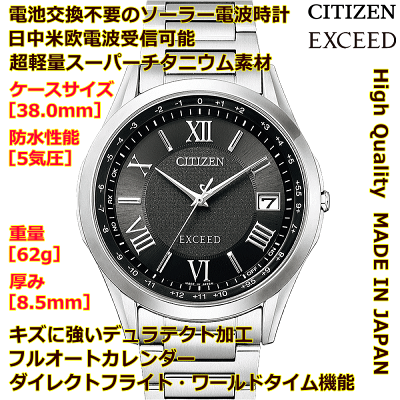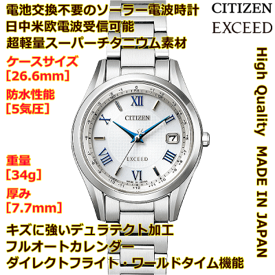 ◆ギフト対応アイコン詳細                     ■主な特徴CITIZEN EXCEED/エクシード エコ・ドライブ電波時計 商品詳細  ※ [ ]は女性用情報ムーブメントエコ・ドライブ電波時計(男性用:光発電2年 女性用:光発電3年) 精度:±15秒/月(非受信時)サイズ重量:62[34]g 厚み:8,5[7,7]mmケースケースサイズ【⇔】:38,0[26,6]mm スーパーチタニウム/デュラテクト加工 表面処理:白色めっき 5気圧防水ガラスサファイアガラス/99%クラリティ・コーティングバンド三ツ折れプッシュタイプ中留特徴パーフェックス搭載 日中米欧電波受信機能受信局自動選択機能 定時受信機能 強制受信機能 衝撃検知機能 針自動補正機能 充電残量表示機能 充電警告機能 過充電防止機能 ワールドタイム機能/26都市[24都市] サマータイム機能■三ツ折れプッシュタイプバンドの参考画像■腕時計のサイズ調整も無料でお受けいたします♪