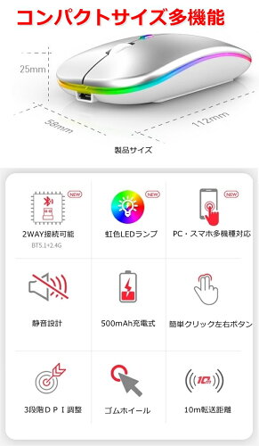 ワイヤレス マウス 静音 Bluetooth 無線マウス 充電式 小型 薄型 2.4GHz 光学マウス 虹色光 LEDランプ 省エネ 持ち運び 高耐久 USBレシーバー オフィス 出張 iPad タブレット Mac Windows PC Laptop Macbook【ネコポス】