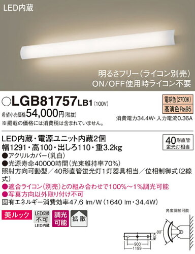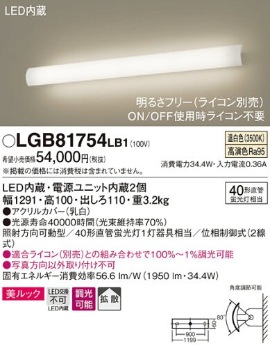照明 おしゃれパナソニック Panasonic 長手配光ブラケットLGB81757LB1 電球色LGB81754LB1 温白色LGB81750LB1 昼白色上下に光を放つ、可動式カバーの長手配光ブラケット アクリルカバー乳白40形直管蛍光灯1灯器具相当