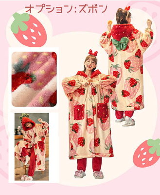 「ズボン追加も可能」パジャマ レディース いちご柄 ナイトガウン もこもこ コート 冬 部屋着 寝間着 イチゴ かわいい 大きいサイズ 4L ポケット付き ルームウェア 冬用 あったか モコモコ 帽子付き 誕生日 プレゼント dh024n1n1w7/代引き不可